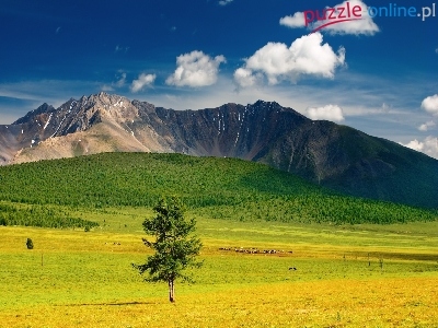 Góry, Żółta, Drzewko, Zielono, Łąka, Małe