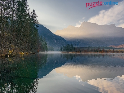 Odbicie, Jezioro Almsee, Góry, Mgła, Austria, Drzewa