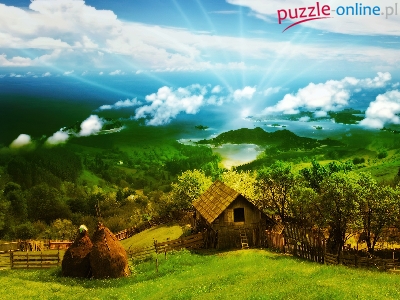 Puzzle Góry, Wieś, Chmury, Jezioro