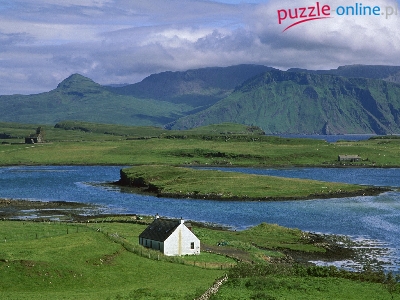 Góry, Szkocja, Łąki, Domek, Wybrzeże