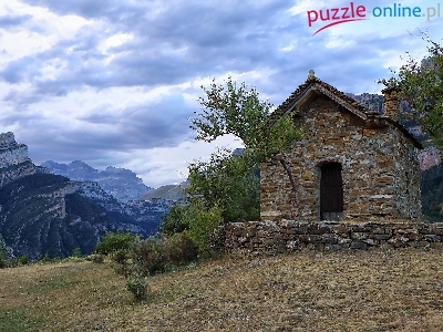 Kamienny, Góry, Domek, Drzewa, Chmury