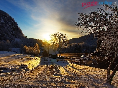 Góry, Wieś, Zachód słońca, Domek, Zima