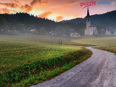 Góry, Zachód słońca, Drzewa, Droga, Pola, Domy, Wieś, Kościół