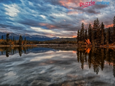 Góry, Niebo, Jezioro, Drzewa, Zachmurzone