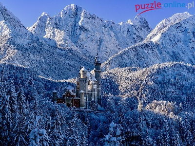 Ośnieżone, Niemcy, Drzewa, Zamek Neuschwanstein, Zima, Bawaria, Góry