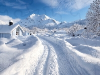 Zaśnieżona, Zima, Drzewa, Góry, Domy, Ośnieżone, Droga