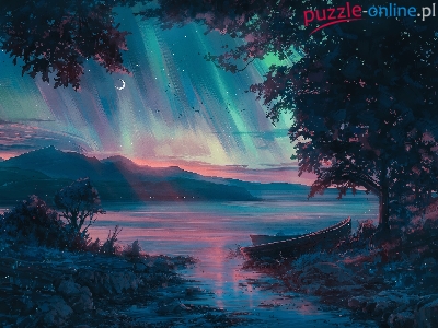 Drzewa, Jezioro, Grafika, Góry, Łódki, Zorza polarna