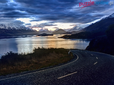 Puzzle Góry, Droga, Jezioro, Chmury