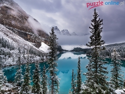 Góry, Mgła, Zima, Jezioro, Drzewa