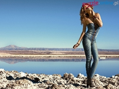 Góry, Jezioro, Jeansy, Kobieta, Kamienie, Lasy