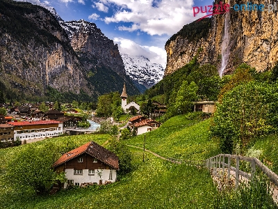 Gmina Lauterbrunnen, Dolina Lauterbrunnental, Kanton Berno, Szwajcaria, Drzewa, Góry, Wodospad Staubbach, Kościół, Droga, Domy