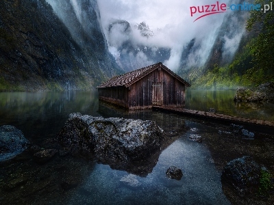Kładka, Park Narodowy Berchtesgaden, Góry, Bawaria, Mgła, Domek, Drewniany, Niemcy, Jezioro Konigssee, Kamienie