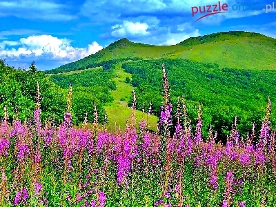 Puzzle Góry, Łąka, Kwiaty, Lasy