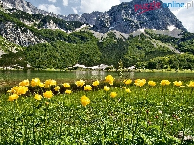 Puzzle Góry, Łąka, Kwiaty, Rzeka
