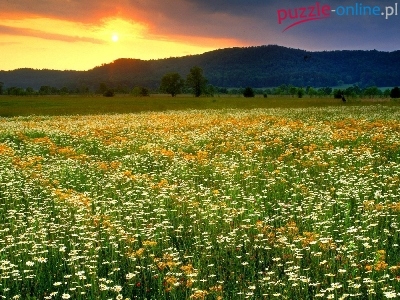 Góry, Słońca, Łąka, Kwiaty, Zachód