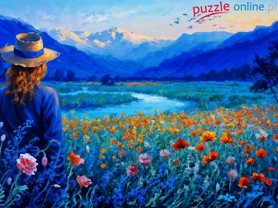 Rzeka, Kobieta, Łąka, Grafika AI, Kwiaty, Kapelusz, Góry
