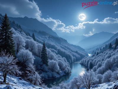 Noc, Zima, Księżyc, Grafika AI, Rzeka, Góry, Las, Śnieg, Drzewa, Oszronione