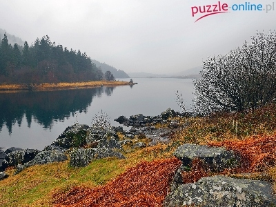 Góry, Kamienie, Jesień, Jezioro, Lasy, Mgła