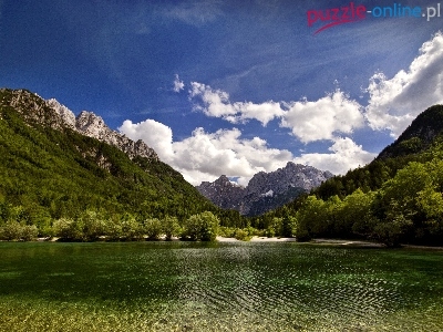 Puzzle Góry, Jezioro, Lasy, Chmury