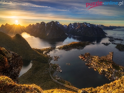 Zachód słońca, Morze, Góry, Norwegia, Lofty