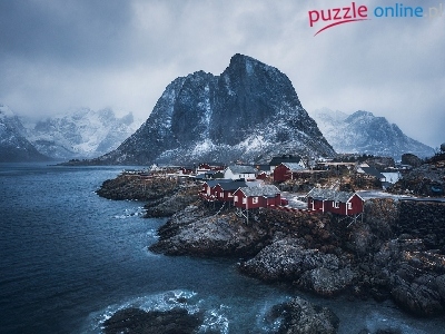 Domy, Lofoty, Morze, Norwegia, Wioska Hamnøy, Góry