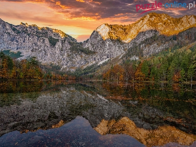 Zachód słońca, Odbicie, Góry, Jezioro, Chmury, Drzewa