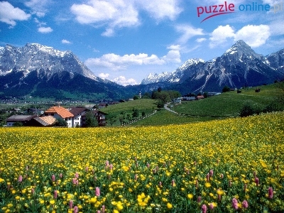 Puzzle Góry, Chmury, Osada, Łąka