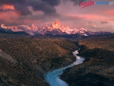 Skarpa, Wschód słońca, Rzeka, Argentyna, Chmury, Góry, Park Narodowy Los Glaciares