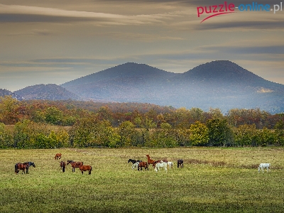 Konie, Góry, Pastwisko, Jesień, Mgła