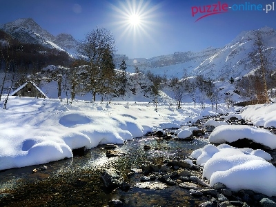 Góry, Drzewa, Zima, Rzeka, Promienie słońca