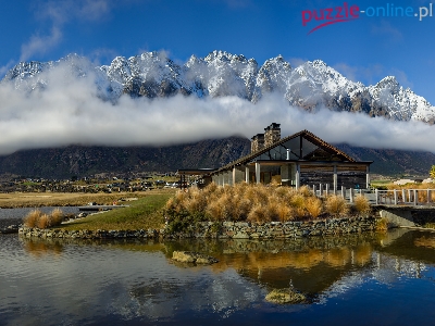 Góry, Queenstown, Dom, Restauracja Jacks Point, Trawa, Jezioro Wakatipu, Nowa Zelandia, Mgła, Most