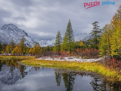Góry Kołymskie, Drzewa, Ośnieżone, Kołyma, Jesień, Potok Nieznany, Rosja, Rzeka