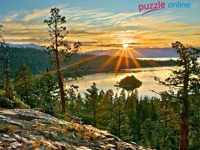 Góry, Słońca, Drzewa, Wschód, Rzeka, Skały