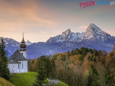 Bawaria, Drzewa, Góry, Berchtesgaden, Sanktuarium Maria Gern, Niemcy, Kościół, Alpy Salzburskie