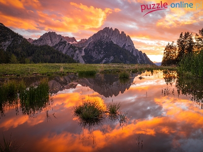 Chmury, Austria, Odbicie, Zachód słońca, Trawa, Góry, Skały, Szuwary, Drzewa, Jezioro