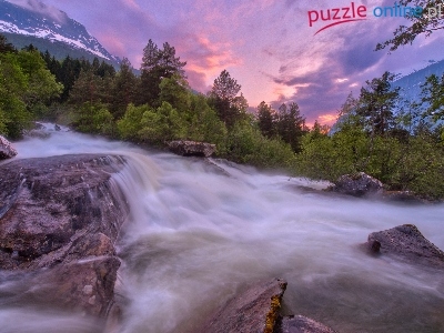 Góry, Słońca, Wodospad, Skały, Zachód