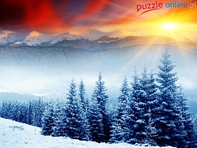 Góry, Zima, Promienie, Słońca, Las