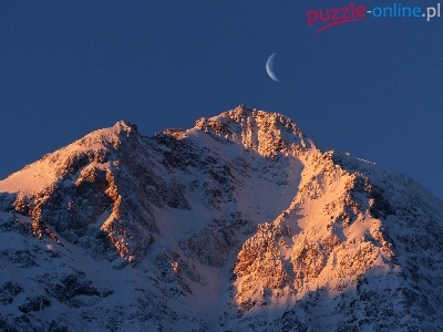 Góry, Księżyc, Zachód, Słońca, Śnieg