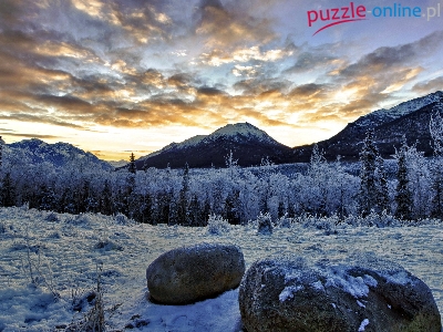 Góry, Zima, Zachód, Słońca, Las