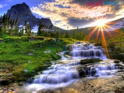 Puzzle Słońce, Góry, Wodospad
