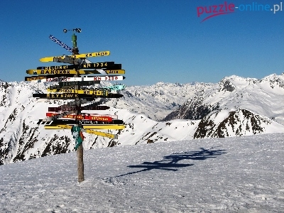 Góry, Śnieg, Austria, Tyrol, Drogowskazy