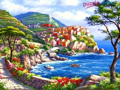 Góry, Kwiaty, Morze, Wybrzeże, Domy