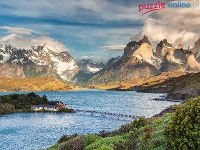 Wyspa, Góry, Chile, Most, Jezioro, Domy, Patagonia