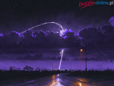 Piorun, Noc, Chmury, Grafika, Latarnie, Droga, Deszcz