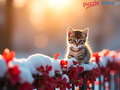 Rośliny, Mały, Czerwone, Grafika, Płot, Kot, Śnieg