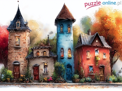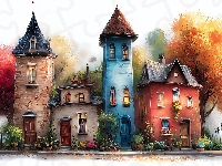 Kolorowe, Kwiaty, Domy, Grafika AI, Drzewa