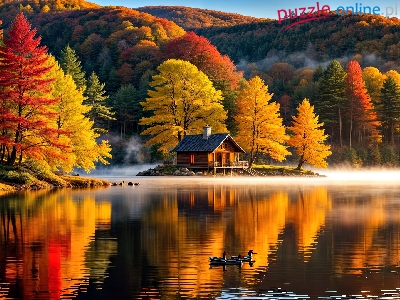 Lasy, Jezioro, Drzewa, Grafika, Wyspa, Dom, Jesień