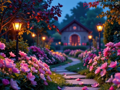 Ogród, Latarnie, Kwiaty, Grafika AI, Drzewa