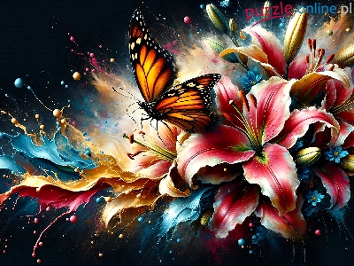 Czarne, Lilie, Farba, Grafika, Motyl, Kwiaty, Tło