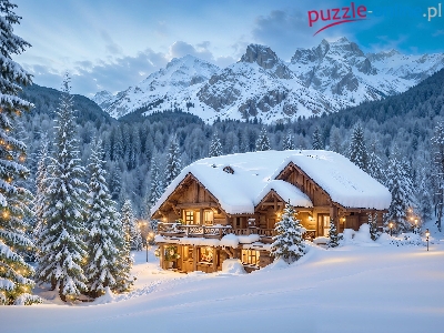 Drzewa, Zima, Góry, Grafika, Dom, Oświetlony, Las